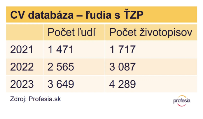 Kým v roku 2021 uverejnilo svoj životopis na portáli Profesia.sk 1 470 ľudí so schopnosťou pracovať zníženou o viac ako 40 percent, o rok neskôr ich bolo už o tisícku viac. Vlani si týmto spôsobom hľadalo prácu už takmer 3 700 uchádzačov a uchádzačiek so zdravotným znevýhodnením. Je to dôkaz, že sú aktívnejší a aj odvážnejší nájsť si svoje miesto na otvorenom trhu práce.