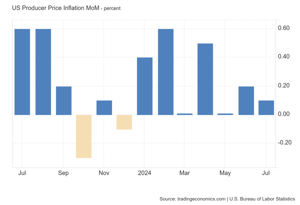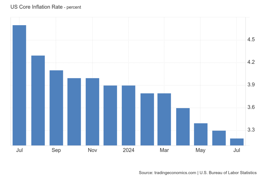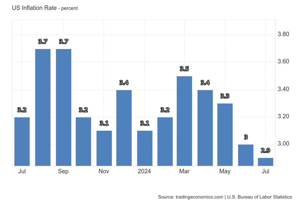 Keďže PPI inflácia bola v norme, dalo sa očakávať, že celková inflácia a jadrová inflácia bude taktiež podľa očakávania analytikov. Celková inflácia za júl bola v USA 2,9 percenta. Inflácia tak zaznamenala už štvrtý pokles za sebou. Trend je teda jasný, inflácia klesá, čo je dobrá správa. Tempo poklesu však zostáva veľmi pomalé. V júni bola inflácia na úrovni 3 percent. Inflačný cieľ je tak stále ďaleko a to je hlavný problém. Týmto tempom by inflácia ešte potrebovala deväť mesiacov pri veľmi skeptickom odhade. A to je stále veľa.