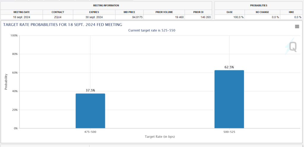 Pred zverejnením inflácie nástroj FedWatch Tool pomeroval šance vyrovnane medzi znížením o 25 alebo 50 bázických bodov. Inflácia za júl investorov nepresvedčila. Šance na zníženie sadzieb o 50 bázických bodov tak poklesli na 37,5 percenta.