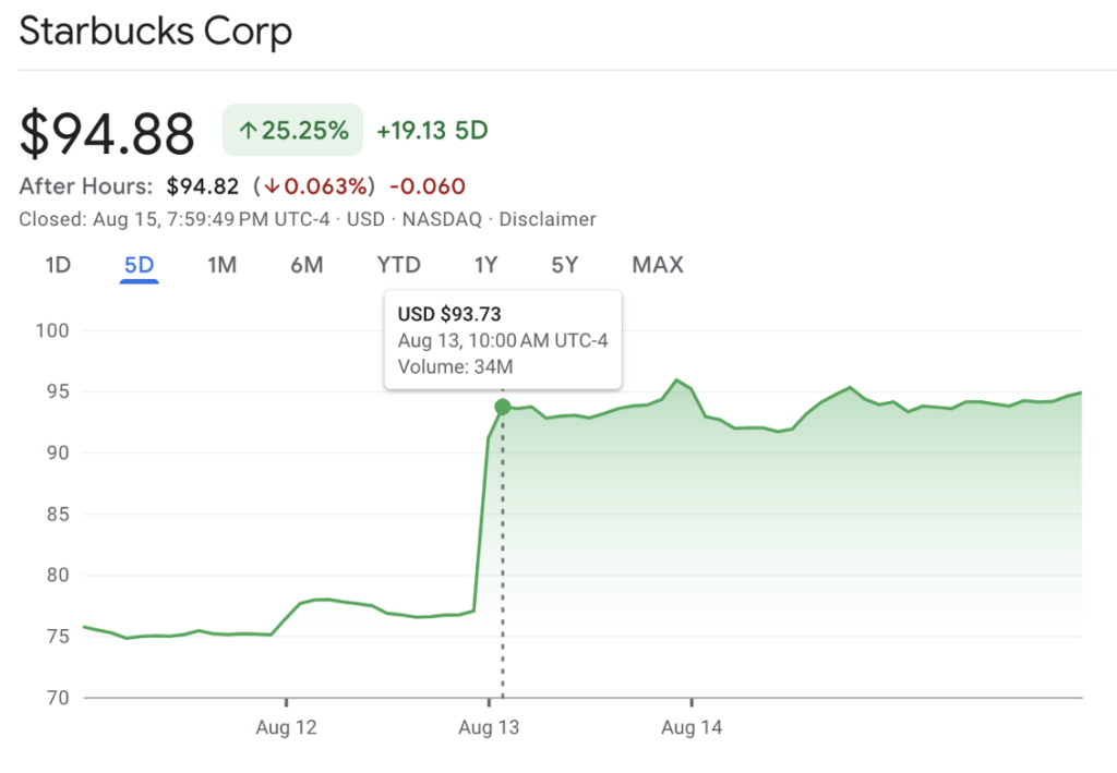 Takýmto rastom reagovala trhová kapitalizácia spoločnosti Starbucks na oznámenie prestupu CEO Briana Niccola zo spoločnosti Chipotle k nim do firmy 13. augusta. Tento prípad dobre ilustruje, že plat (ani cena produktu) sa neodvíja od ceny práce (vstupov), ale od vzniknutej hodnoty.