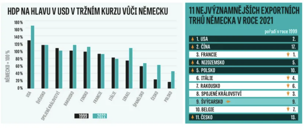 Pre zaujímavosť tam potom nájdete ešte niekoľko ďalších ekonomík, ako napríklad Česko, Izrael, Poľsko, Spojené kráľovstvo, Švédsko a Spojené štáty. Sú zoradené podľa relatívnej hospodárskej výkonnosti na obyvateľa v porovnaní s Nemeckom v roku 1999, takže 100 percent znamená rovnakú výkonnosť v danom roku (1999 alebo 2022). Tí, ktorí majú svetlozelený stĺpec vyšší ako čierny, počas existencie eurozóny v porovnaní s Nemeckom získali. A naopak.