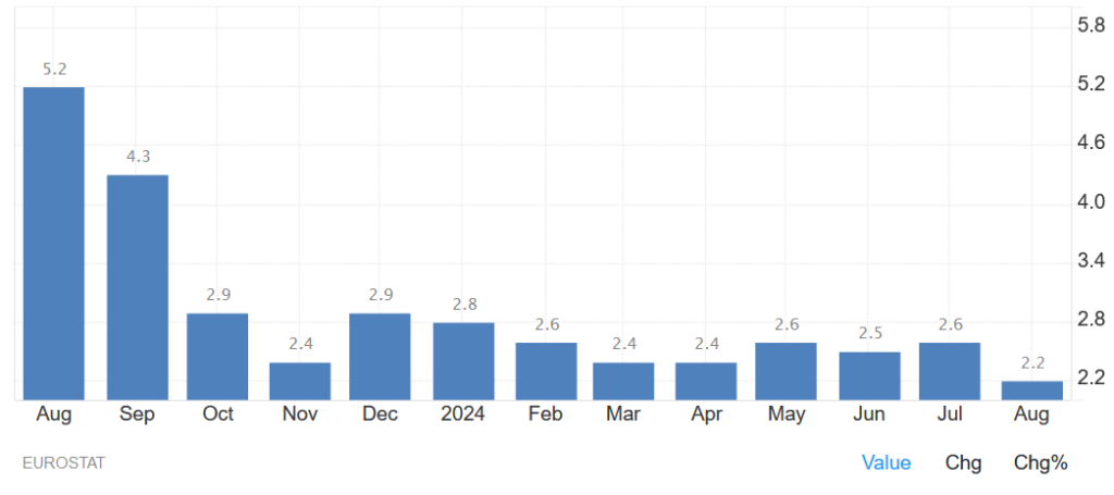 V skutočnosti údaje hovoria jasne – augustová inflácia v eurozóne dosiahla 2,2 percenta. Vzhľadom na nízky hospodársky rast a pokles cien ropy je nepravdepodobné, že by sa inflácia v Európe výrazne zvýšila. Výhľad na budúci rok je optimistický – napríklad vo Francúzsku sa v roku 2025 očakáva medziročný rast cenovej hladiny na úrovni 1,85 percenta. Ak k tomu pripočítame slabnúcu ekonomiku, ECB by mala znižovať sadzby omnoho rýchlejšie ako americký Fed.