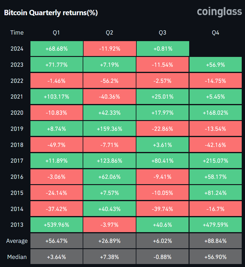 Z tabuľky vyplýva, že historicky sú pre bitcoin najlepšie štvrtý a prvý štvrťrok. Pokiaľ sa bude história opakovať, je v nadchádzajúcich dvoch štvrťrokoch veľká pravdepodobnosť, že by bitcoin mohol prekonať svoje ATH (all-time high) z marca roku 2024.