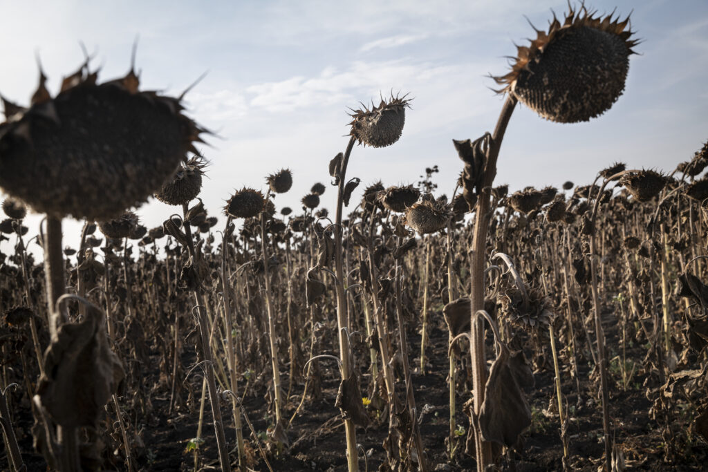 Na okolitej poľnohospodárskej pôde sa rozprestierajú nezožaté slnečnicové polia.