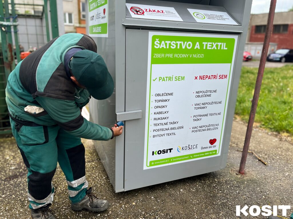 K povinnému zberu textilného odpadu, ktorý bude u nás zavedený v januári 2025, Marián Christenko, generálny riaditeľ spoločnosti KOSIT, a. s., uviedol: „Obyvateľom sme už teraz poskytli možnosť zbaviť sa nepotrebných vecí zodpovedným spôsobom, a hlavne s vedomím, že si šatstvo nájde cestu k ľuďom v náročných životných situáciách.“
