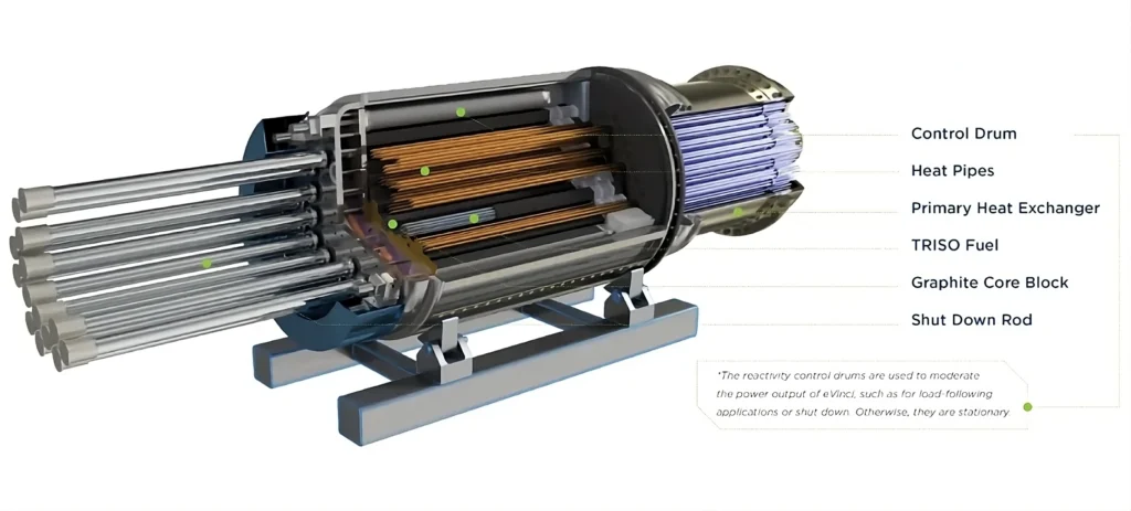 Mikroreaktor eVinci má zaujímavú konštrukciu prakticky bez pohyblivých častí, čo zvyšuje jeho spoľahlivosť. Jedinou súčasťou, ktorá sa pohybuje, je riadiaci valec (Control Drum). Zmenou jeho polohy sa mení tok neutrónov a tak reguluje výkon reaktora.