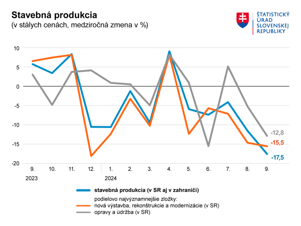Objem stavebnej produkcie za trištvrte roka presiahol 5,1 miliardy eur a oproti rovnakému obdobiu vlani bol nižší o 7,2 percenta. Spomalili všetky jej zložky, dominantná nová výstava o 8,7 percenta, opravy a údržba o 3,3 percenta.