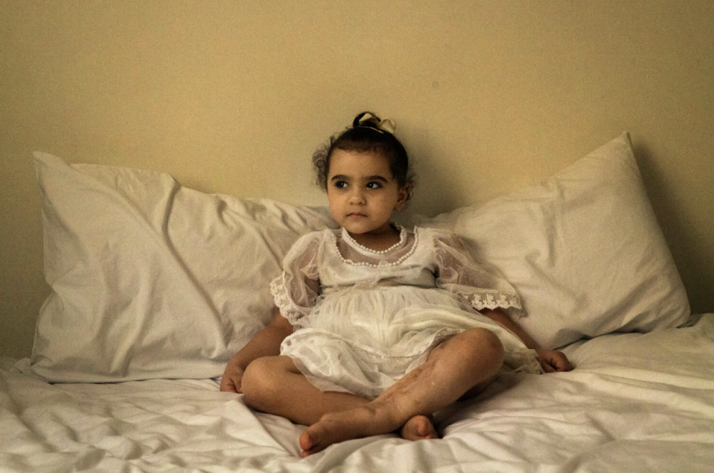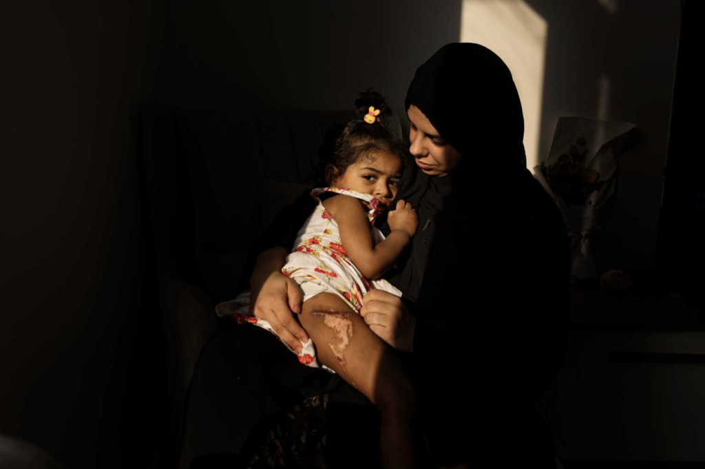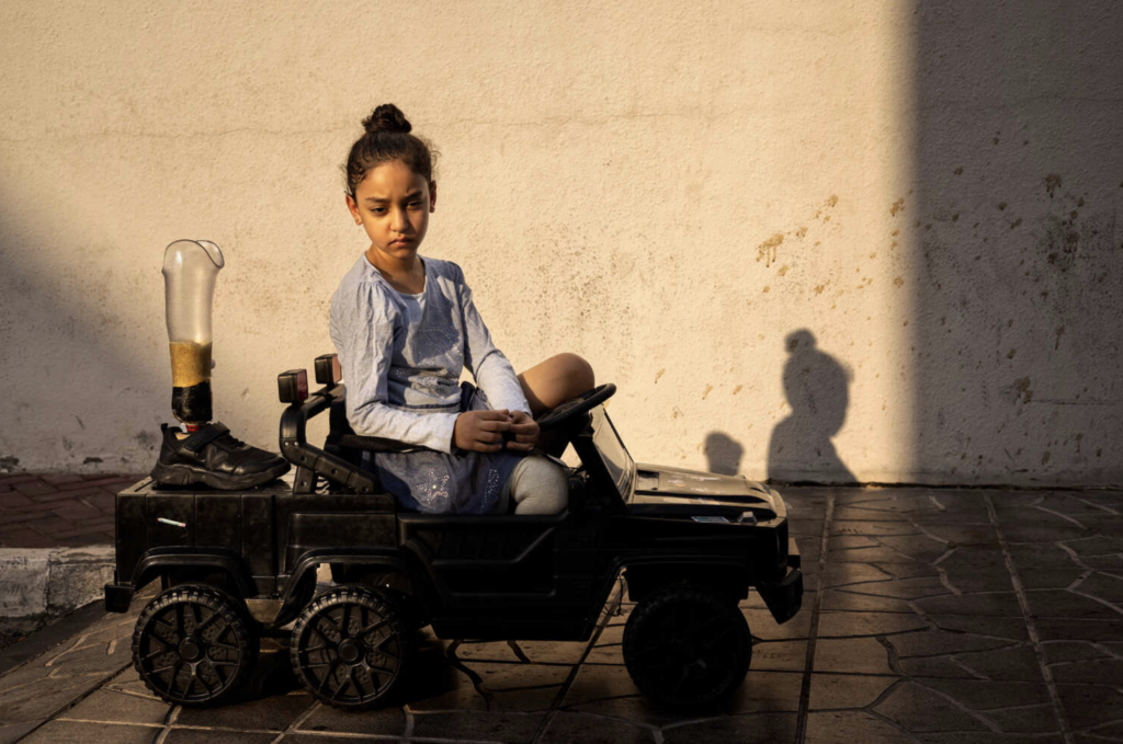 Štvorročná Sadeen Nofalová bola vytiahnutá z trosiek svojho domu po výbuchu, ktorý zabil jej matku a otca. "Jej noha sa infikovala a potrebovala operáciu, pretože infekcia sa dostala až ku kosti," hovorí jej stará mama.
