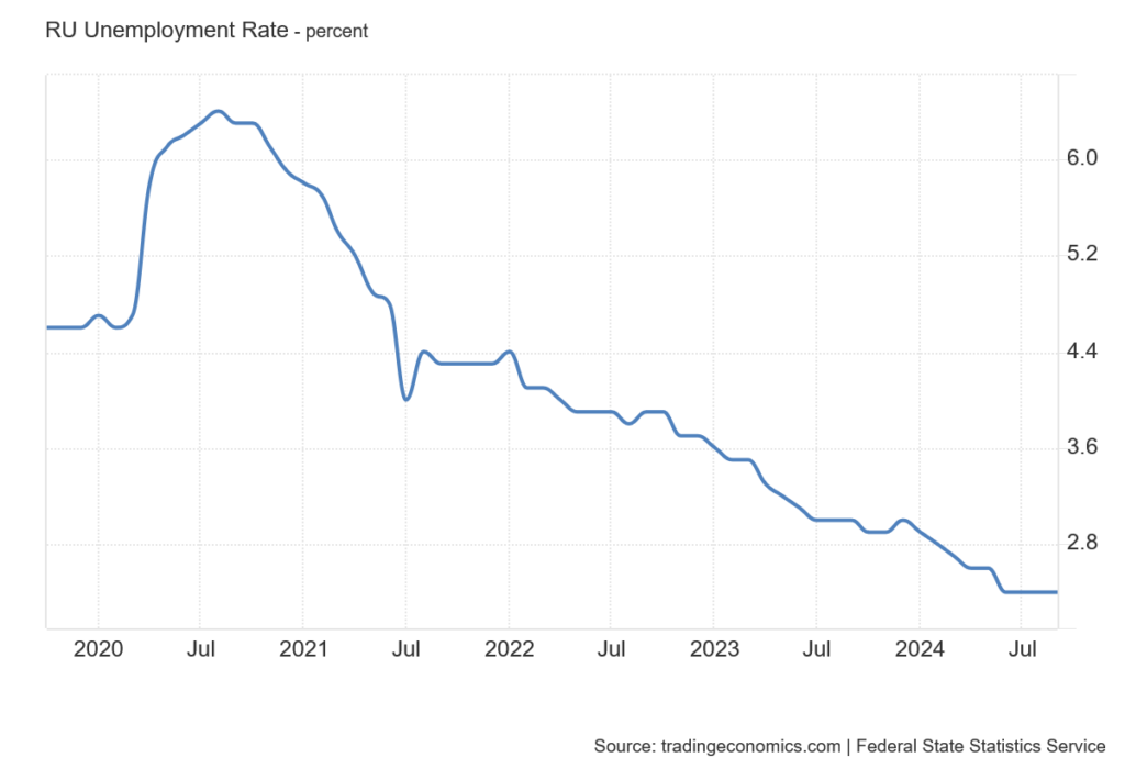 Aj v Rusku však narastá nervozita. Hoci má Moskva vojenskú prevahu, dlhodobý konflikt ruskú ekonomiku vyčerpáva. Problémy tamojšieho hospodárstva ilustrujú dva kľúčové faktory. Prvým sú vysoké úrokové sadzby, ktoré majú brániť inflácii aj odlivu kapitálu. Druhým je historicky nízka miera nezamestnanosti, čo ukazuje na takmer úplnú mobilizáciu pracovných síl.