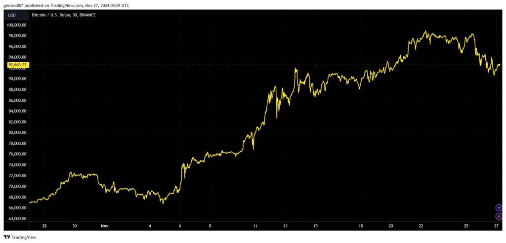 V čase písania článku sa cena bitcoinu znovu vzdialila psychologickej hranici 100-tisíc dolárov a dosiahla 92 182 dolárov. Za posledných päť dní bitcoin stratil 6,32 percenta. Tento prepad je po troch týždňoch silného rastu o viac ako 46 percent takmer zanedbateľný. Na druhej strane je vidieť, že hranica 100-tisíc dolárov predstavuje silnú rezistenciu, ktorú mnohí analytici považovali za skôr symbolickú.