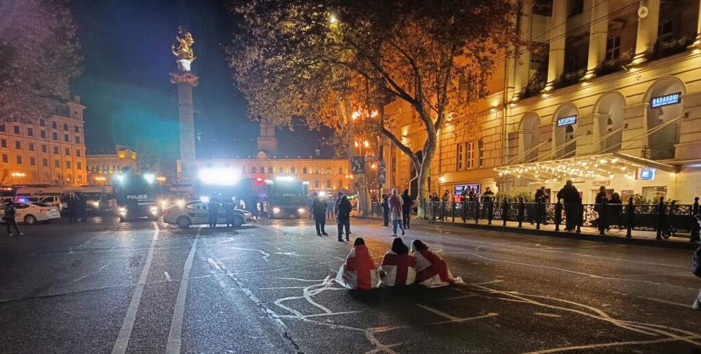 V noci sa situácia mení. Mladé rodiny a dôchodcovia po prvej výzve polície odchádzajú. Ostávajú tí, ktorí sa cítia mentálne a fyzicky pripravení postaviť sa útoku poriadkovej polície. Na bulvár dopadajú kanistre so slzotvorným plynom, vodné delá spúšťajú koordinovanú paľbu a muži z poriadkovej polície začínajú svoj pomalý, avšak koordinovaný postup vpred. V ceste im stoja improvizované barikády, ohne, lietajúce dlaždice a ľudia v ochranných prostriedkoch rôzneho stupňa improvizovanosti od prostých šatiek po kvalitné plynové masky. Tento scenár sa v centre Tbilisi v rôznych obmenách a narastajúcej intenzite opakuje už od štvrtka, keď gruzínsky premiér Irakli Kobachidze oficiálne pozastavil integráciu krajiny do EÚ.