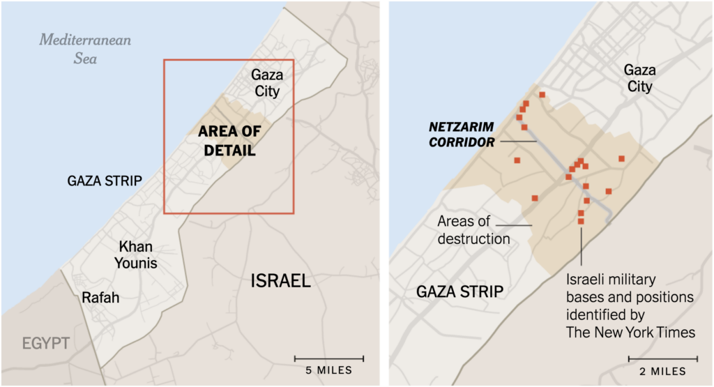 Od prvých mesiacov vojny v Gaze izraelské sily obsadili šesťkilometrovú cestu známu ako koridor Netzarim, ktorá pretína enklávu, aby zabránili státisícom vysídlených obyvateľov Gazy v návrate na sever. Podľa izraelskej armády a analýzy satelitných snímok a videozáznamov, ktorú uskutočnil denník New York Times, sa z tohto územia pomaly stal blok s rozlohou 46 štvorcových kilometrov, ktorý kontrolujú izraelské sily.