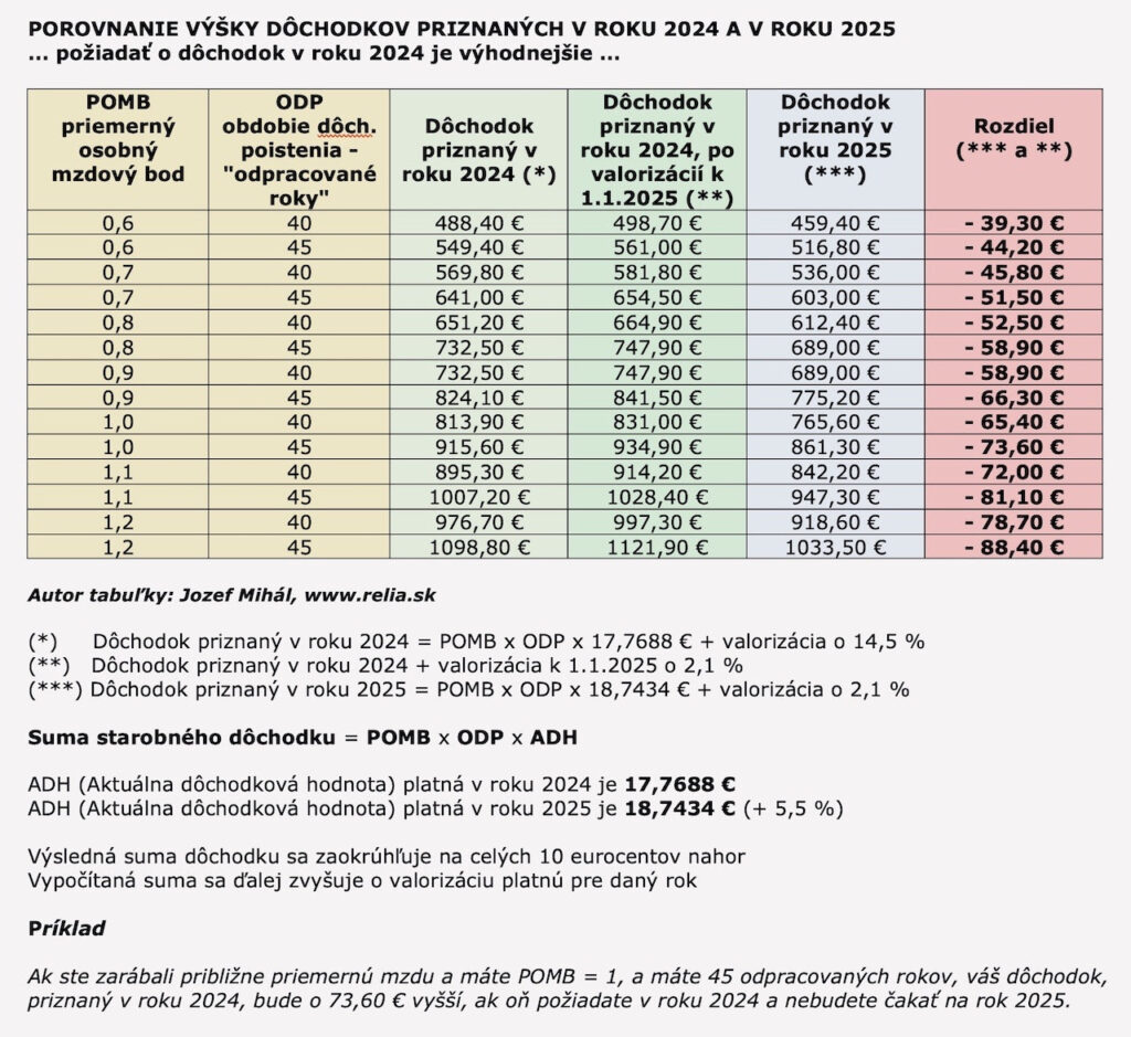 Rozdiel medzi výškou starobnej renty, ak o ňu požiadate ešte v roku 2024, a tou, ktorú by vám vypočítali od januára, spôsobuje valorizácia, ktorá vám dôchodok priznaný v tomto roku zvýši o 14,5 percenta. "Naproti tomu, pri výpočte dôchodku v roku 2025 bude ADH vyššia len o 5,5 percenta, čo vo výsledku znamená rozdiel deväť percent v prospech dôchodkov priznaných v roku 2024," vyčísľuje expert a pridáva aj tabuľku.