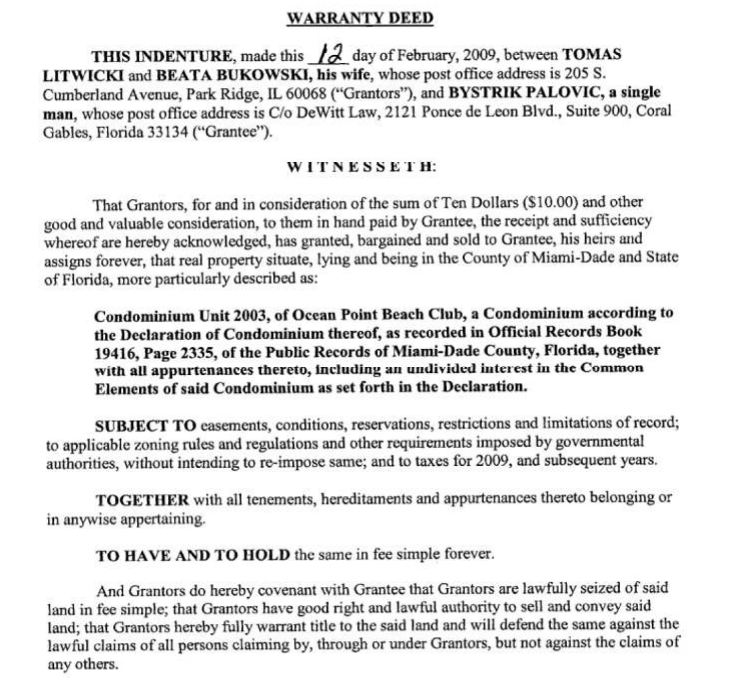Pod týmto prevodom je podpísaný ako notár(ka) Brandi Hilton, ktorý(á) má rovnakú adresu, ako si Palovič uvádza ako svoju poštovú adresu pri kúpe prvého apartmánu, čo je adresa právnickej kancelárie DeWitt Law.