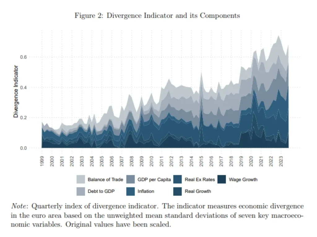 Obaja autori zostavujú nový ukazovateľ miery makroekonomickej rozdielnosti – čiže divergencie – a konštatujú, že jeho „zreteľný nárast znamená vzostup divergencie v rámci eurozóny“. Ukazovateľ zostavujú na štvrťročnej báze pre všetky kvartály od vzniku eurozóny v roku 1999 až do konca vlaňajška. Predstavuje nevážený priemer štatistickej miery rozptylu siedmich kľúčových makroekonomických veličín – reálneho hospodárskeho rastu, hrubého domáceho produktu na obyvateľa, inflácie, rastu miezd, úrovne verejného dlhu v pomere k hrubému domácemu produktu, reálneho výmenného kurzu voči Nemecku a konečne bilancie vzájomného obchodu s Nemeckom. Najmenší rozptyl – teda maximálnu zladenosť – vyjadruje hodnota „0“, najväčší potom hodnota „1“.