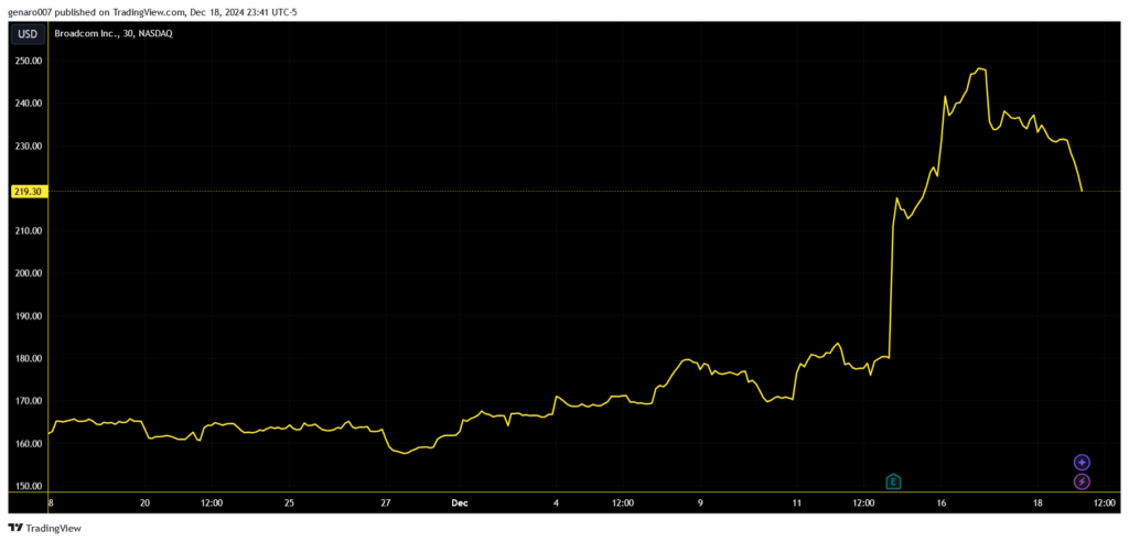 Pokles akcií spomínanej spoločnosti vykompenzoval silný rast akcií firmy Broadcom. Za rastom Broadcomu sa skrývajú silné predaje. Tento rok firma plánuje predať tovar pre sektor umelej inteligencie vo výške 12,2 miliardy dolárov. Predaje pre tento sektor sa za posledný rok strojnásobili.