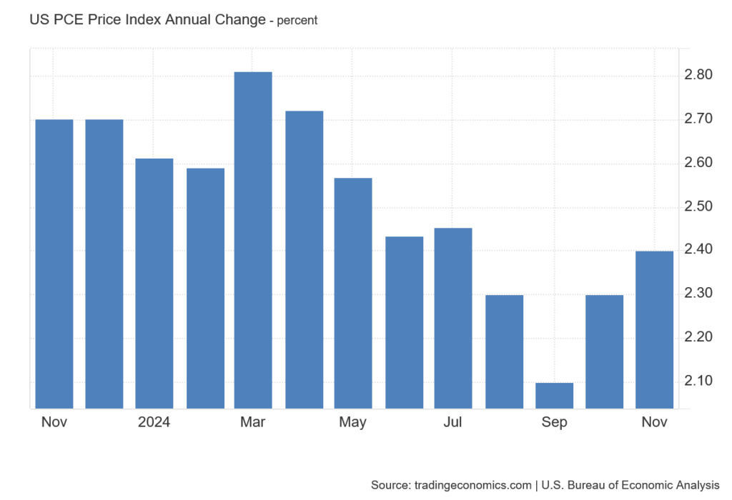 V poslednej projekcii Fedu z decembra 2024 bol silne zvýšený výhľad na infláciu PCE v roku 2025. Ak sú predikcie Fedu správne, tak by inflácia PCE mala dosiahnuť 2,5 percenta namiesto 2,1 percenta očakávaných v septembri 2024.