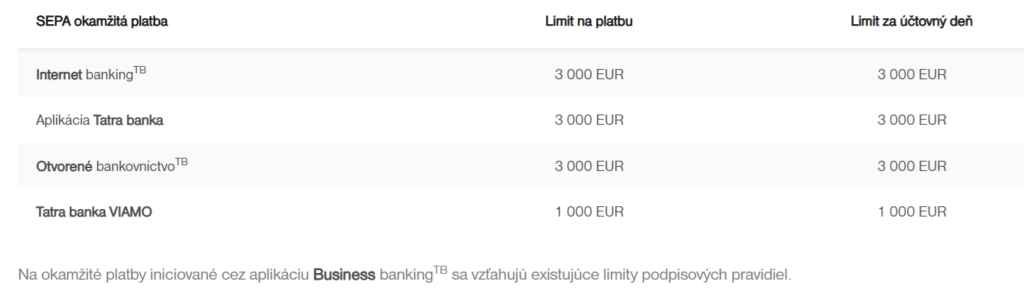 Podrobne svojich klientov o možnostiach informuje aj Tatrabanka. "Pre SEPA okamžité platby platia samostatné limity. Tieto limity sa započítavajú do limitov pre SEPA a zahraničné platby," vysvetľuje banka na svojom webe. Špecifikuje aj limity.