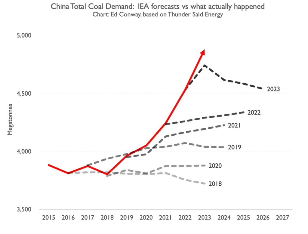 Vidíte, že je to vo všeobecnosti rovnaký model. Tentoraz sa však nepozeráme na celkovú solárnu produkciu, ale na niečo iné. Pozeráme sa na a celkové množstvo uhlia spáleného v Číne. IEA každoročne predpovedá, že spotreba uhlia sa ustáli alebo klesne. A každý rok sa ukáže, že sa mýlila. V skutočnosti Čína spaľuje čoraz viac uhlia.