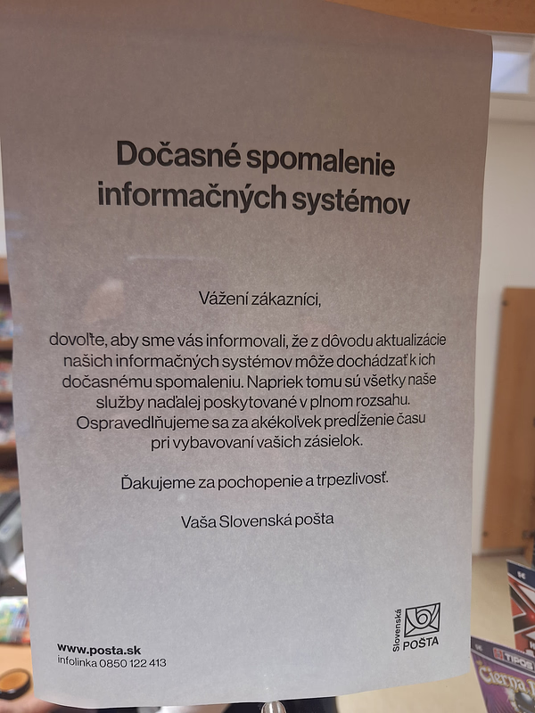 Písomný oznam na dverách jednej z pobočiek Slovenskej pošty, ktorý poslali čitatelia redakcii denníka Štandard, informuje, že napriek dočasnému spomaleniu informačných systémov sú všetky služby pošty naďalej poskytované v plnom rozsahu.