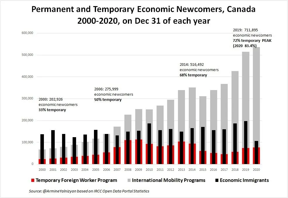 Potom sú tu sociokultúrne otázky. V posledných rokoch Kanaďania menej podporujú vysokú mieru imigrácie v krajine. Trudeau krajinu otvoril oveľa väčšiemu počtu menej kvalifikovaných dočasných pracovníkov. V čase pandémie bola väčšina cudzincov prichádzajúcich do Kanady dočasná.