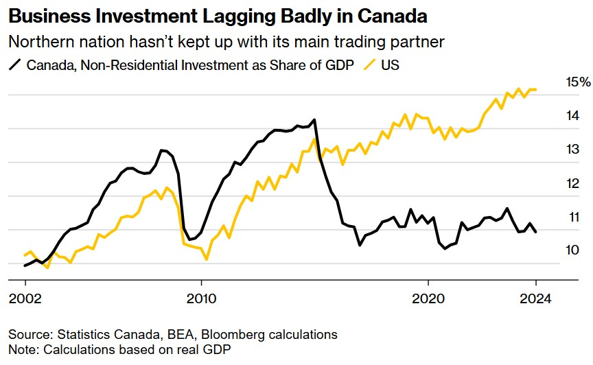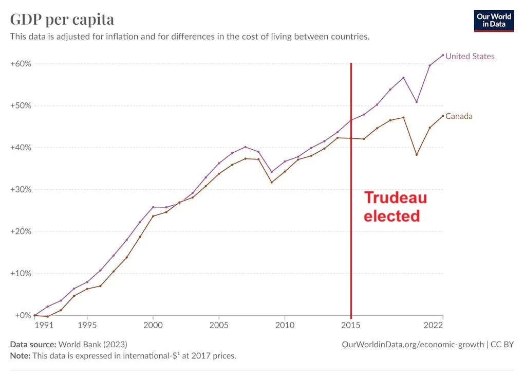 Ceny ropy nie sú dobrým vysvetlením tejto postpandemickej stagnácie, keďže od roku 2019 výrazne vzrástli. Ani ťažba ropy sa za vlády Trudeaua nezrútila – napriek investičnému suchu dosiahla kanadská ťažba ropy v roku 2022 a opäť v roku 2023 historické maximum, rovnako ako vývoz ropy. Kanadské podnikateľské investície však zostali nízke a životná úroveň sa napriek tomu vyrovnala a začala klesať.
