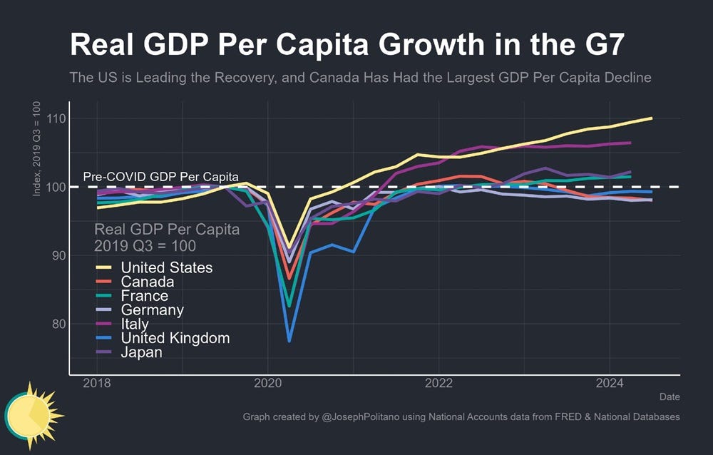 Je to však ilúzia, ktorú vytvorila Kanada tým, že v týchto rokoch prijala obrovské množstvo dočasných migrantov. Životná úroveň krajiny v prepočte na obyvateľa nedosahovala úroveň celej zvyšnej skupiny G7, aj keď životná úroveň Ameriky rástla.