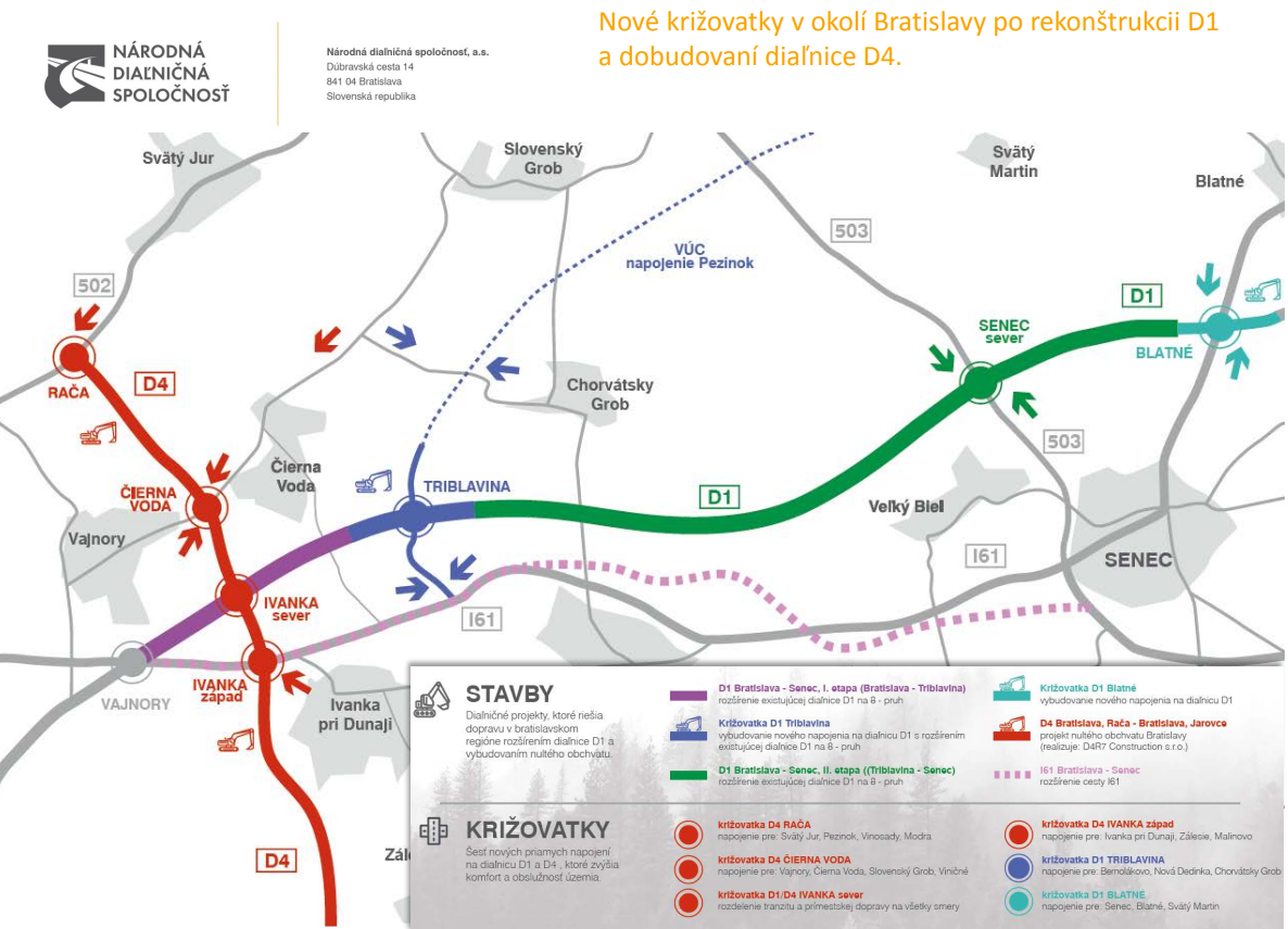 Kedy budú hotové práce na D1 pri Bratislave, ktorých súčasťou je aj dostavba križovatky D1 a D4? Poľská stavebná spoločnosť Budimex sa podľa zmluvy s NDS z novembra 2022 zaviazala túto stavbu dokončiť do troch rokov. Teda do konca tohto roka. Zmluvná cena prác v objeme skoro 111 miliónov eur po viacerých zmenách vzrástla zatiaľ na 112,6 milióna eur bez dane z pridanej hodnoty.