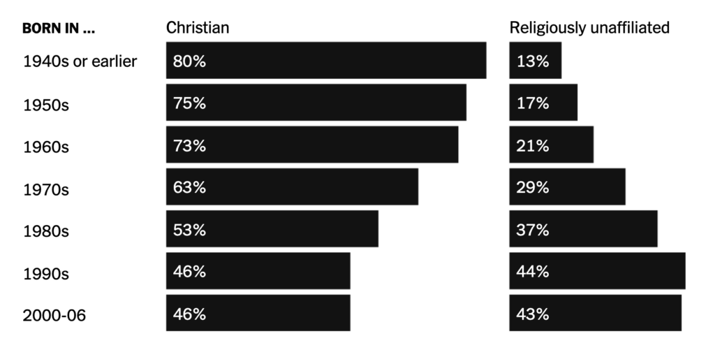 Zdá sa, že ľudia v najmladšej vekovej skupine v novom prieskume, narodení v rokoch 2000 až 2006, sa tomuto trendu vymykajú. Stále je u nich menej pravdepodobné, že sa budú hlásiť ku kresťanstvu, ako je priemer, a to oveľa menej ako u najstarších Američanov. Výskumníci sú však prekvapení, že nie sú menej nábožensky založení ako účastníci prieskumu z druhej najmladšej kohorty – ľudia narodení v 90. rokoch 20. storočia.