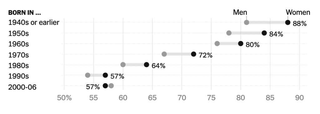 Najmladší účastníci prieskumu vynikali aj v iných ohľadoch. Rozdiel v religiozite medzi mužmi a ženami je oveľa menší ako u starších generácií. Ženy sú zvyčajne viac nábožensky založené ako muži na základe rôznych ukazovateľov. Tento vzorec je taký stály naprieč časom, geografiou a kultúrou, že ho niektorí vedci charakterizujú ako zákonitosť ľudského života. Tento vzorec sa prejavuje v najstarších kohortách PRC, kde napríklad pravdepodobnosť, že sa ženy budú modliť každý deň, je o 20 bodov vyššia ako pri mužoch.