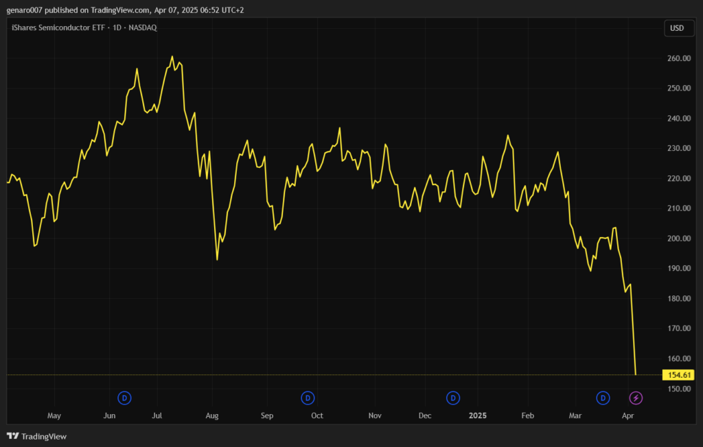 Prepad akcií polovodičových firiem ukazuje krehkosť súčasného systému. Index SOXX, zložený z týchto spoločností, utrpel ťažkú ranu. Jeho predchádzajúci rast bol spojený s technologickými očakávaniami a potenciálom, ale teraz sa ukazuje, že tieto očakávania boli do istej miery prehnané.