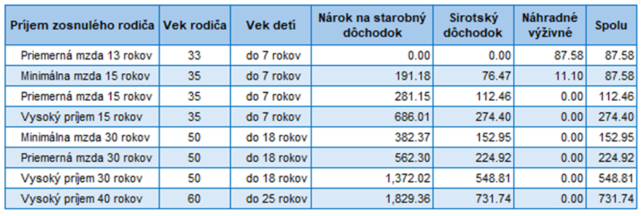 V nasledujúcej tabuľke uvádzam niekoľko modelových situácií, keď zomrie rodič dlhodobo poberajúci minimálnu mzdu, priemernú mzdu (aktuálne asi 1500 EUR/mes) a príjem vo výške trojnásobku priemernej mzdy (aktuálne asi 4500 EUR/mes). Jednotlivé modelové situácie sa v bežnej praxi nevyskytujú rovnako často. K 31. 1. 2025 poberalo 834 detí sirotský dôchodok do výšky 76 EUR mesačne, zatiaľ čo 1 dieťa poberalo sirotský dôchodok viac ako 1000 EUR mesačne. Presnú sumu Sociálna poisťovňa neposkytla. Chcel som poukázať na dôsledky nastavenia, keď sa pozerá na príjem a odpracované roky rodiča a ignorujú sa potreby dieťaťa. Mnohé deti totiž dostávajú nižší sirotský dôchodok ako je životné minimum dieťaťa.