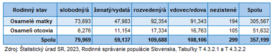 Skúsme sa pozrieť na to, aké domácnosti osamelých rodičov na Slovensku máme, a aspoň stručne načrtnúť ich hlavné problémy. Vychádzať budem z publikácie Štatistika v súvislostiach - Rodinné správanie populácie Slovenska, ktorú v roku 2023 vydal Štatistický úrad SR na základe údajov zo sčítania obyvateľov, domov a bytov 2021. Vzhľadom na množstvo dát v tabuľkách som niektoré zjednodušil alebo skombinoval. Ako zdroj tabuliek budem uvádzať čísla tabuliek v publikácii, z ktorých som vychádzal.