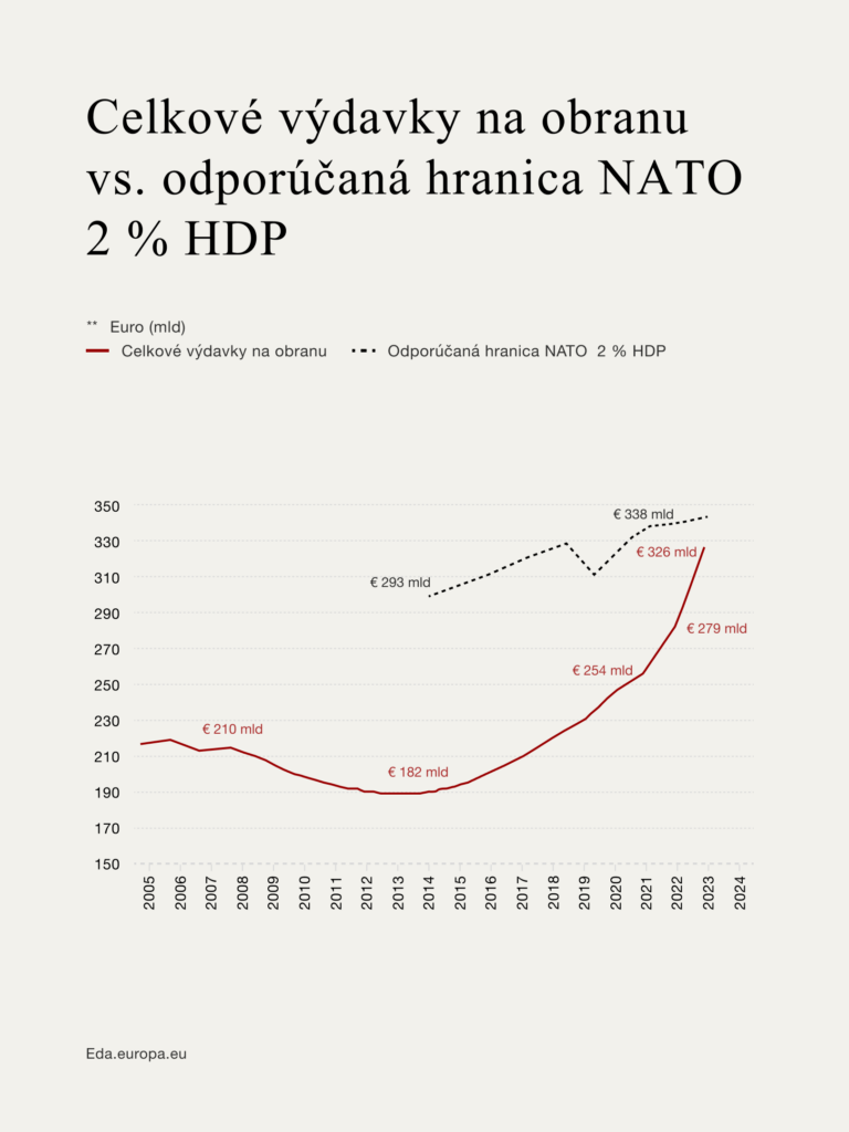 Nedávne geopolitické posuny podnietili Ursulu von der Leyenovú, aby presadzovala výraznejšie zvýšenie vojenských výdavkov. No aj tento prehodnotený návrh, ktorý je skromnejší než Macronova pôvodná vízia, si vyžaduje minimálne 800 miliárd eur na vybudovanie dôveryhodných európskych obranných síl. Členské štáty EÚ však naďalej nedosahujú plánovaný cieľ NATO v oblasti výdavkov na obranu vo výške dvoch percent z HDP: v roku 2024 v priemere dosiahli len 1,9 percenta.