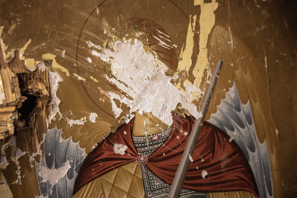 Vrch oltára bol rozbitý, bombardovanie prerazilo diery v kamenných stenách a v modrej kupole nad svätyňou a rozhádzalo trosky po drevených laviciach. Mnohé ikony chýbali a tie, ktoré zostali, boli počmárané.