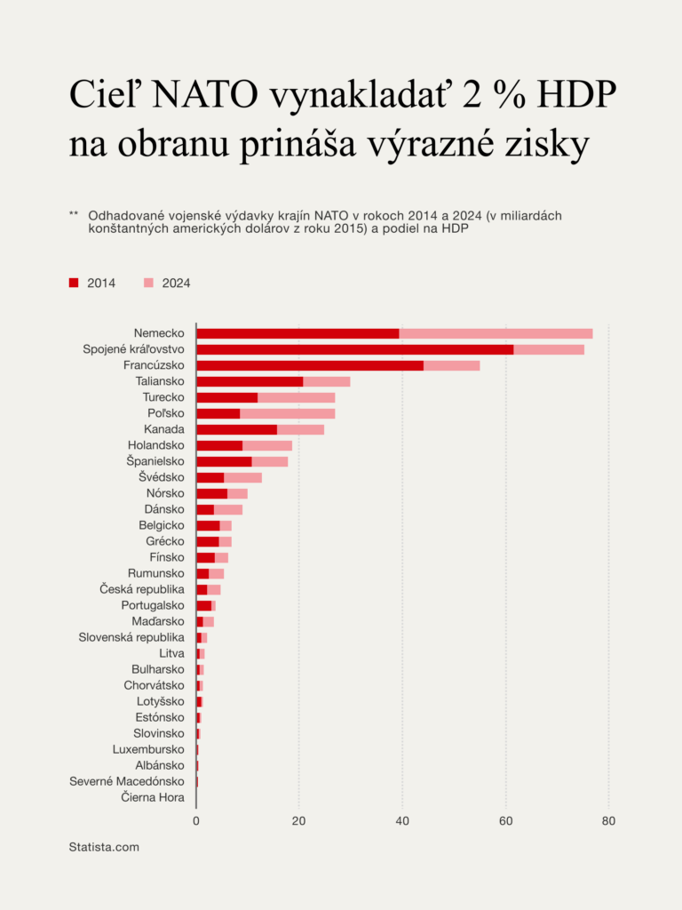 Trumpovi slúži ku cti, že jeho hra na zlého policajta priniesla výsledky. Len 11 z 30 členov NATO splnilo v roku 2023 cieľ dávať dve percentá HDP na obranné výdavky. Na základe obnoveného tlaku sa tento počet do konca roka 2024 zvýšil na 23.