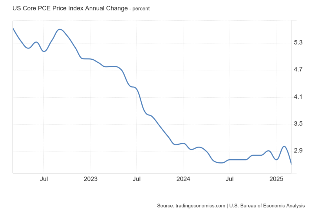 Trumpove šance na úspech potvrdzuje ďalší makroekonomický údaj – inflácia PCE za marec 2025. Medzimesačný rast inflácie bol prvýkrát za päť rokov nulový. Medziročná inflácia PCE dosiahla 2,6 percenta, čo je tiež priaznivý výsledok.