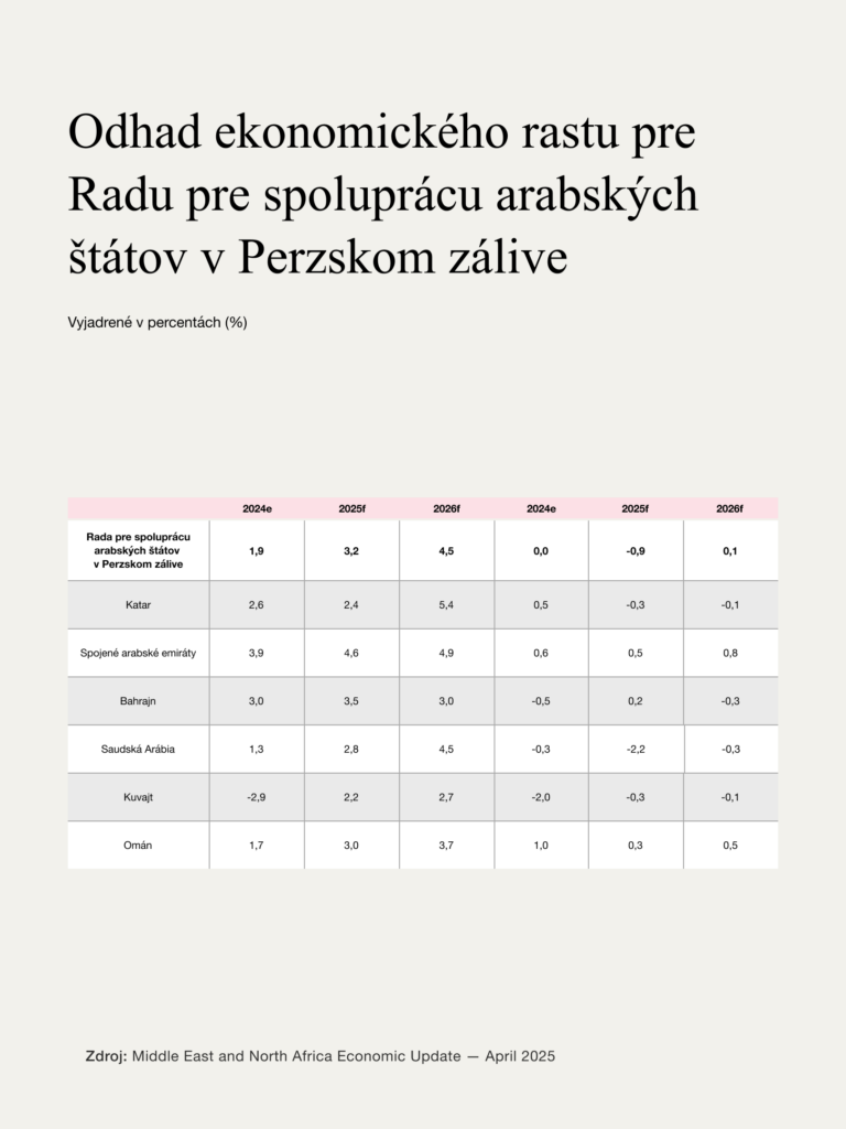 Výkyvy cien ropy priamo ovplyvňujú aj hospodárske výsledky regiónu. Po tom, ako v roku 2023 ekonomiky krajín v rámci GCC prakticky stagnovali na úrovni len 0,4 percenta, v roku 2024 zaznamenali mierne oživenie (1,9 percenta), ktoré bolo spôsobené predovšetkým priaznivými cenami ropy, a nie štrukturálnymi hospodárskymi reformami.