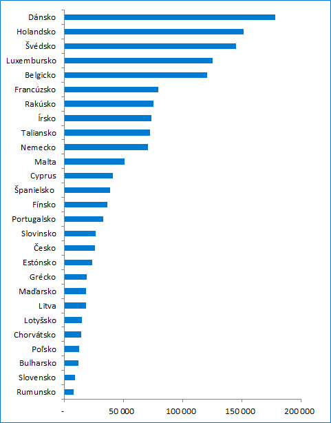 Údaje za všetky štáty o priemernom čistom finančnom majetku na jedného obyvateľa v eurách ku koncu minulého roka sú v nasledujúcom grafe.