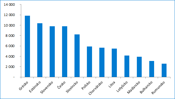Pozícia Slovenska by bola lepšia, ak by jeho obyvatelia boli menej zadlžení. Keď sa pozrieme, aký dlh majú v priemere obyvatelia nových členských štátov vrátane Grécka, uvidíme, že Slovensko je vpredu. V nasledujúcom grafe sú zoradené štáty podľa dlhu na jedného obyvateľa v eurách ku koncu minulého roka.