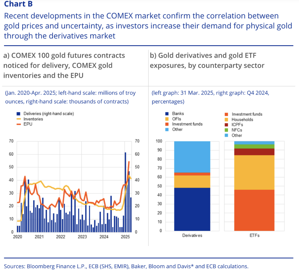 Toto píše Európska centrálna banka. Zaujímavé je, že zlatu venovala celú časť svojej májovej Správy o finančnej stabilite. Tento odlev zlata z Európy do USA bolo možné pozorovať na rôznych ukazovateľoch už začiatkom tohto roku.