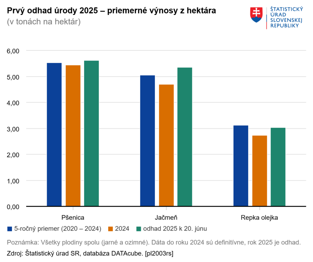 Na medziročnom očakávanom náraste o 11 percent by sa mal podieľať najmä nárast hektárových výnosov všetkých sledovaných komodít. Vyplýva to z prvého odhadu úrody, ktorý na základe informácií zozbieraných k 20. júnu 2025 spracoval Štatistický úrad (ŠÚ) SR.