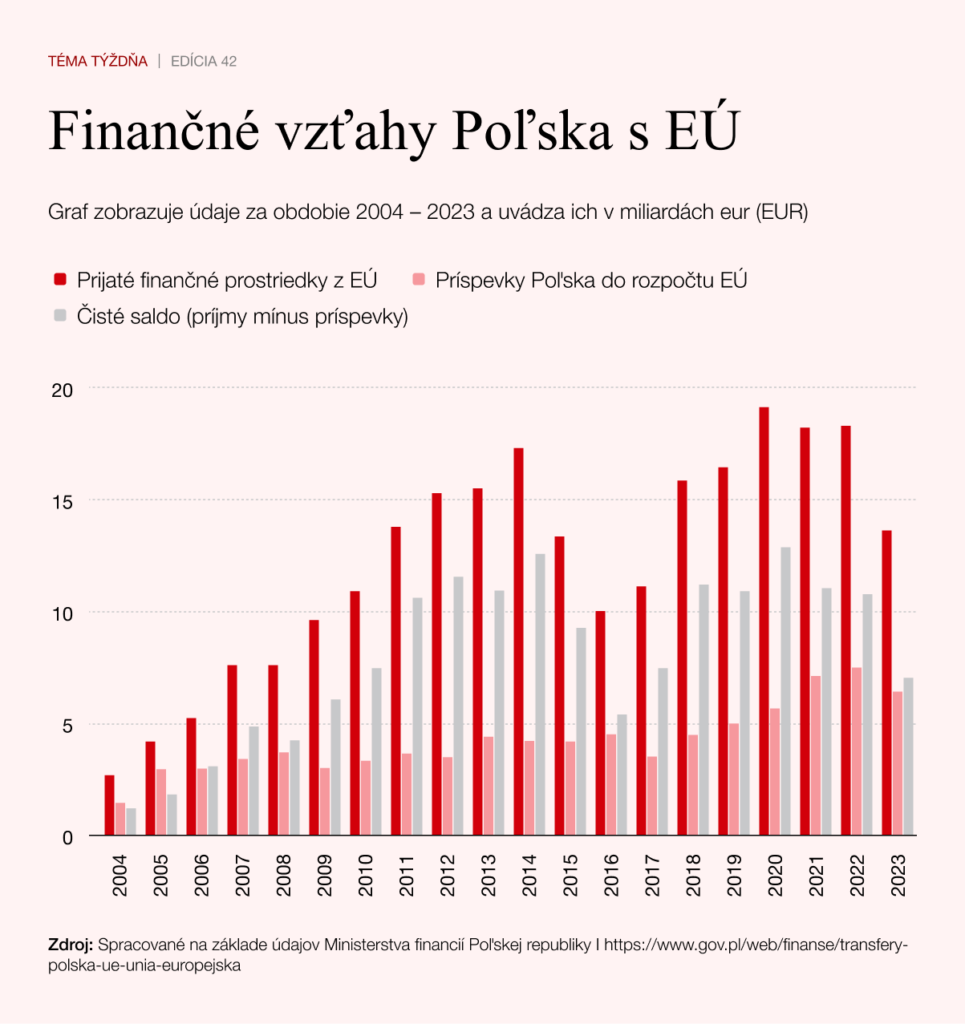 Hoci sa Poľsko pomaly mení na čistého prispievateľa do rozpočtu EÚ, stále je najväčším príjemcom európskych fondov podľa celkového objemu získaných prostriedkov. Od vstupu do EÚ v roku 2004 získalo obrovské finančné výhody. Podľa Varšavskej ekonomickej školy (SGH) dosiahol čistý príjem Poľska z EÚ v rokoch 2004 až 2023 pôsobivých 161,8 miliardy eur, zatiaľ čo jeho príspevky boli 83,7 miliardy eur. Čistý zisk približne 78 miliárd eur potvrdzuje jeho pozíciu ako jedného z najväčších prijímateľov podpory z EÚ. Len v rokoch 2021 a 2022 získalo Poľsko o osem miliárd eur viac, ako zaplatilo, čím si upevnilo svoje miesto medzi hlavnými čistými prijímateľmi v rámci Únie.