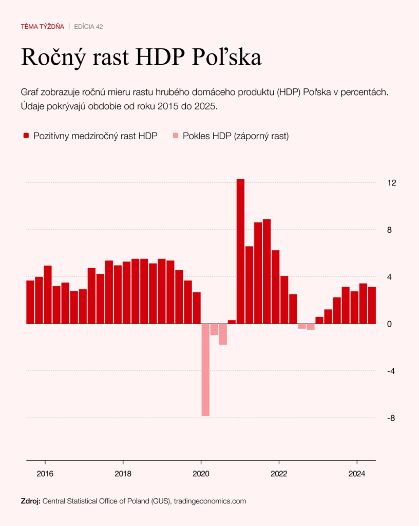 Poľská ekonomika si stále vedie lepšie ako väčšina krajín EÚ. Podľa Národnej banky Poľska sa očakáva rast HDP na úrovni 3,6 percenta v roku 2025, 3,1 percenta v roku 2026 a 2,5 percenta v roku 2027, čo je výrazne viac ako predpokladaný jednopercentný rast v eurozóne. Inflácia by pritom mala klesnúť pod dve percentá.