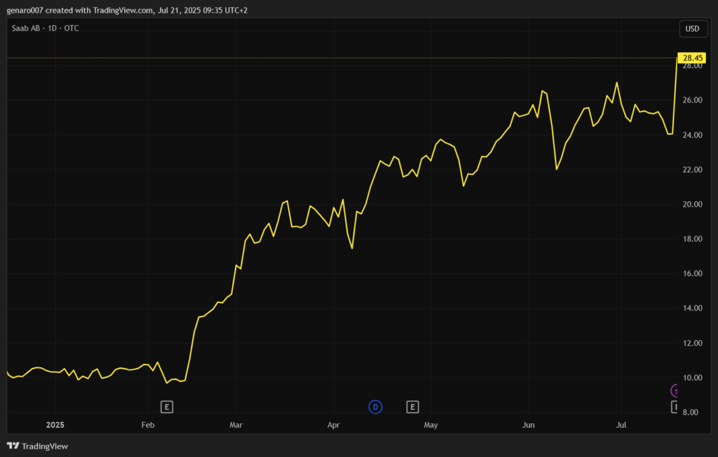 Po nemeckej spoločnosti Rheinmetall sa na európskom akciovom trhu darí akciám zbrojárskych spoločností Saab. Svoje hospodárske výsledky predstavila švédska spoločnosť Saab. Ponúka veľké množstvo rôznych vojenských produktov, od stíhačiek JAS 39 Gripen cez protitankové zbrane, ponorky, radary až po maskovacie a ochranné systémy. Vzhľadom na vojnu na Ukrajine a záväzok krajín NATO vynakladať na obranu 5 % HDP má zbrojársky priemysel dostatok práce. Potvrdili to aj hospodárske výsledky za druhý štvrťrok.